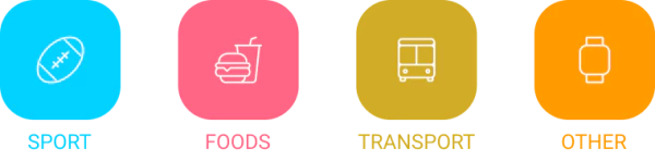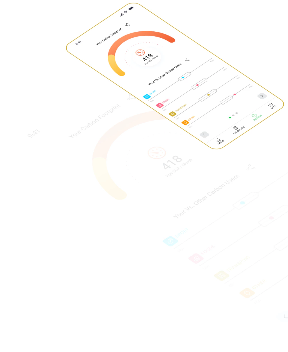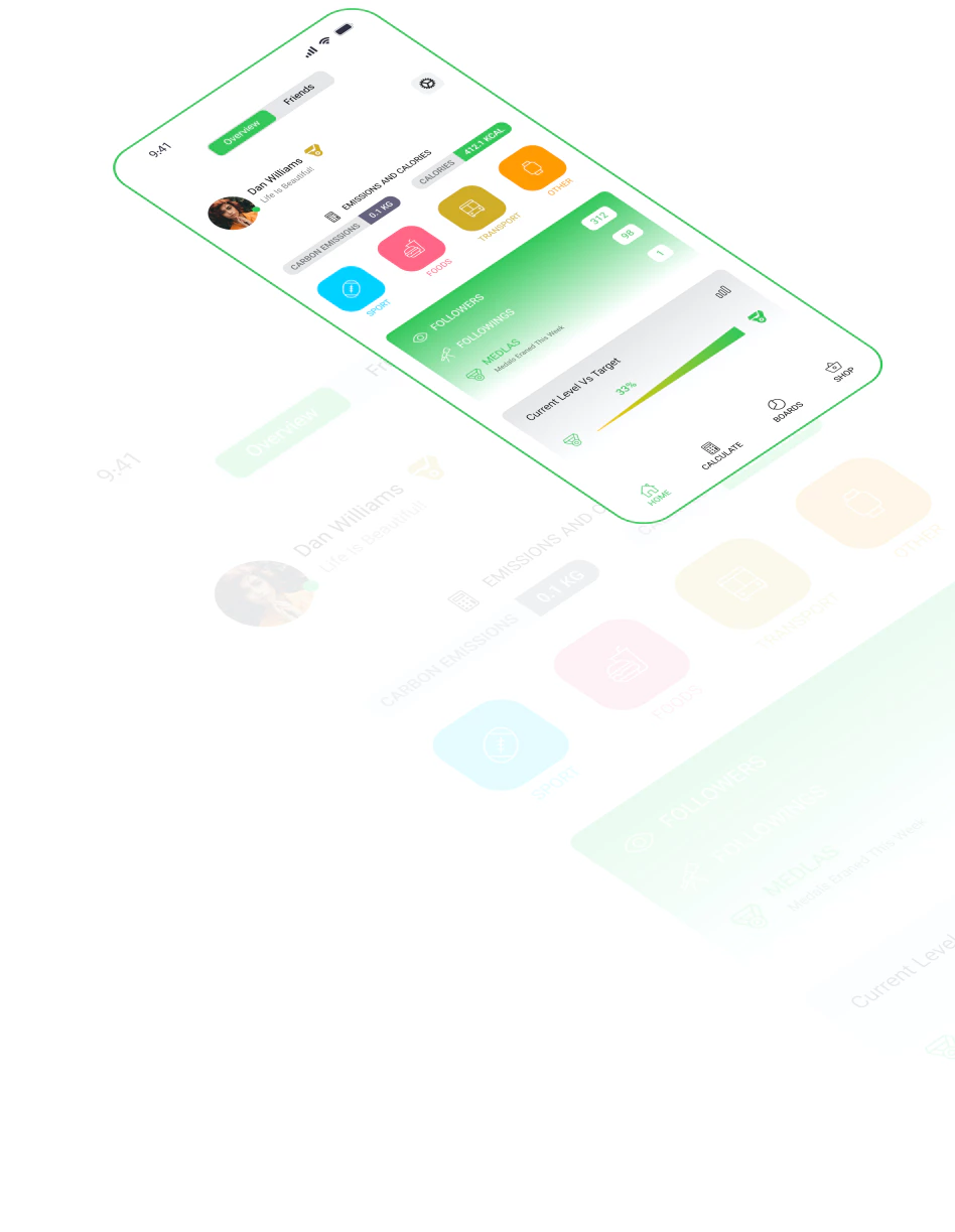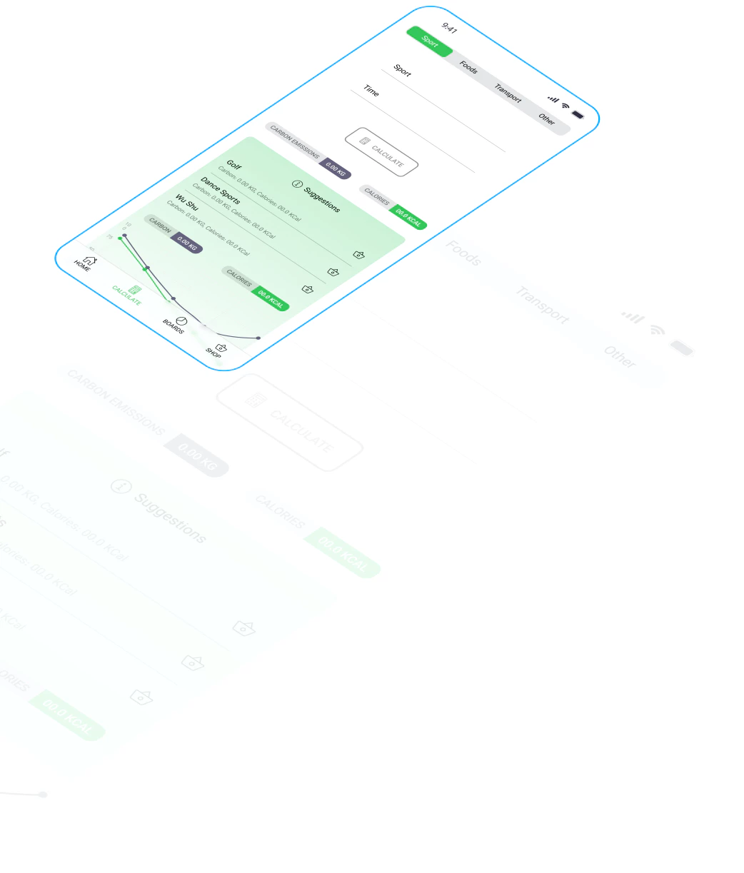 to access your carbon footprint and calorie consumption. select the function you need from Sports, Food, Transport and Shop.